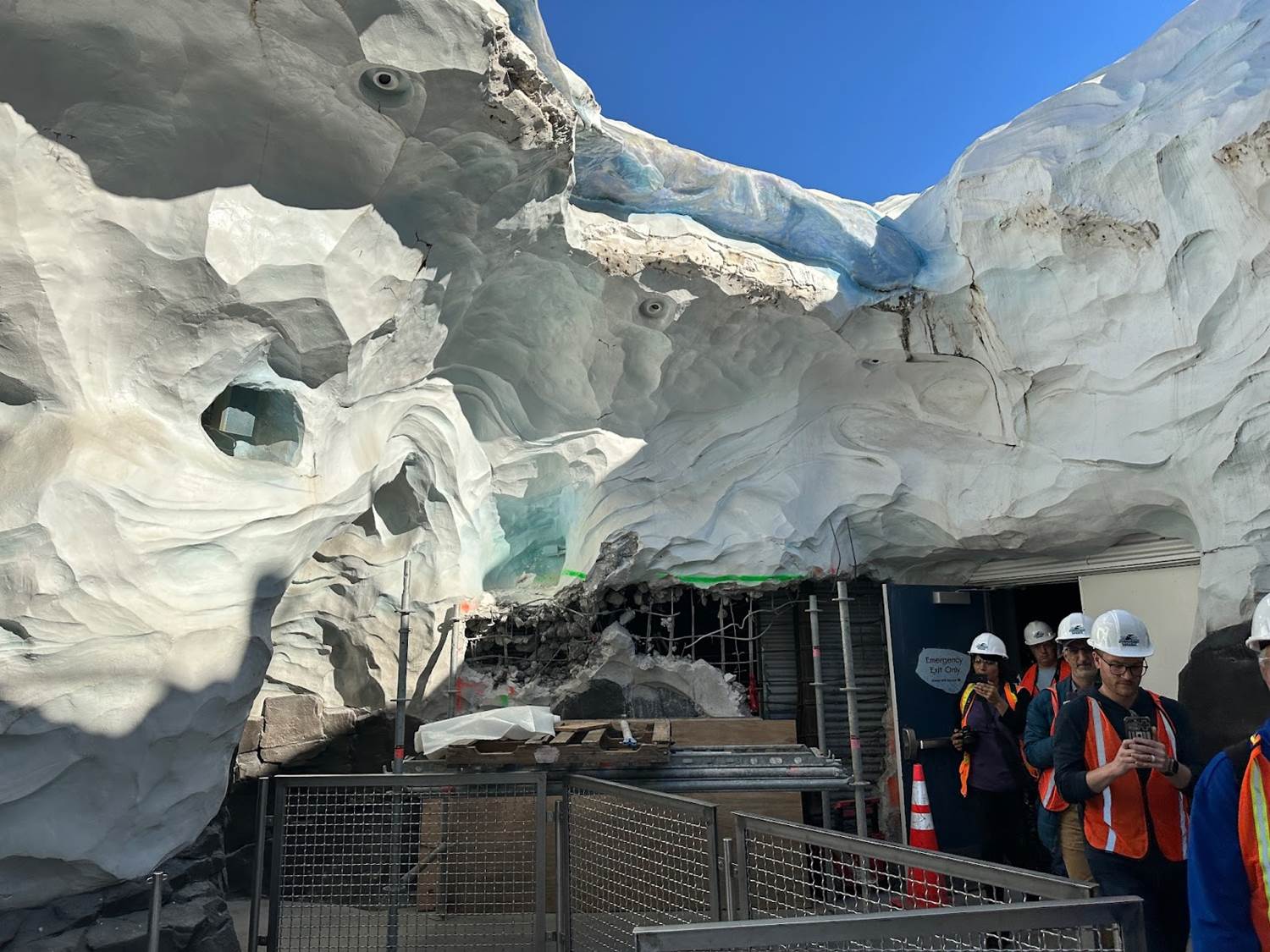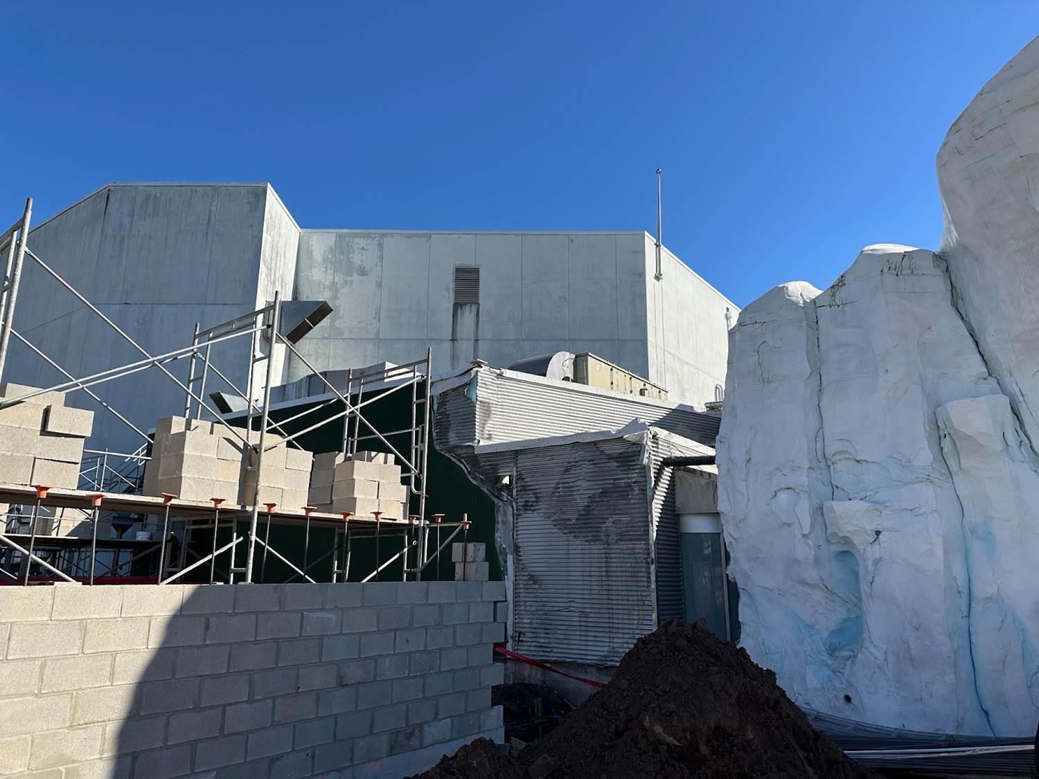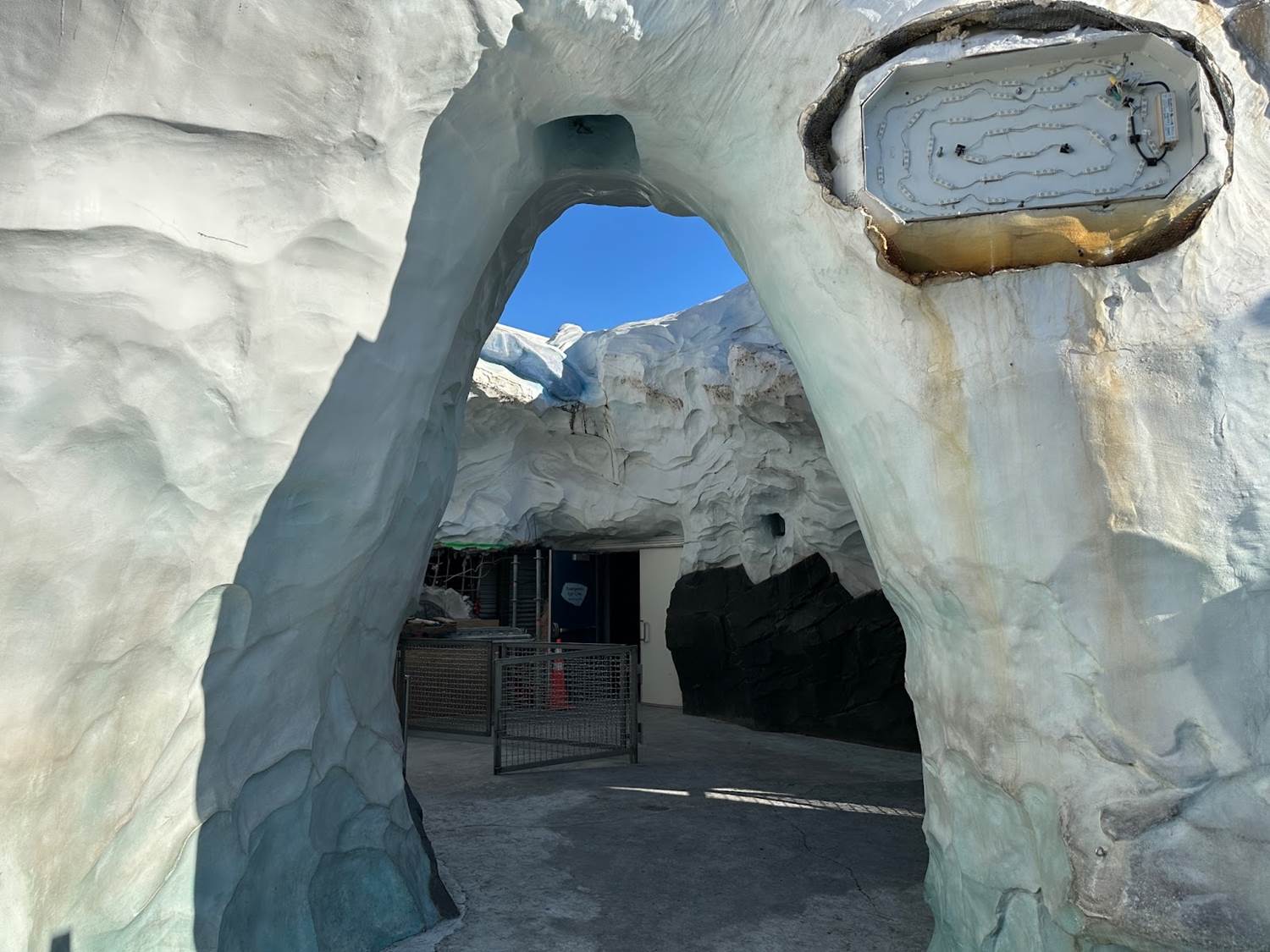 Outside the main entrance to the attraction, the arctic rockwork is being refurbished.