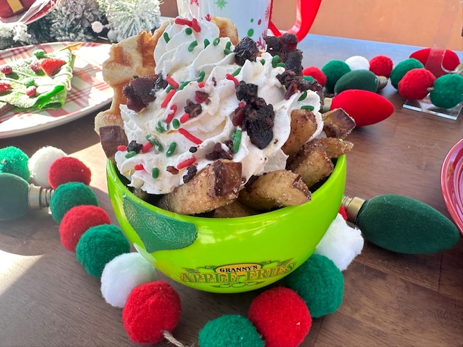 Maple walnut ice cream, a warm pearl sugar waffle, Granny Smith apple fries, and crispy candied bacon, drizzled with pure Vermont maple syrup in a souvenir bowl.