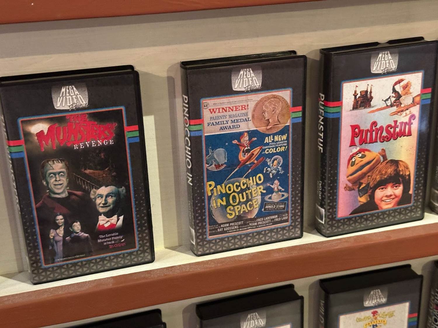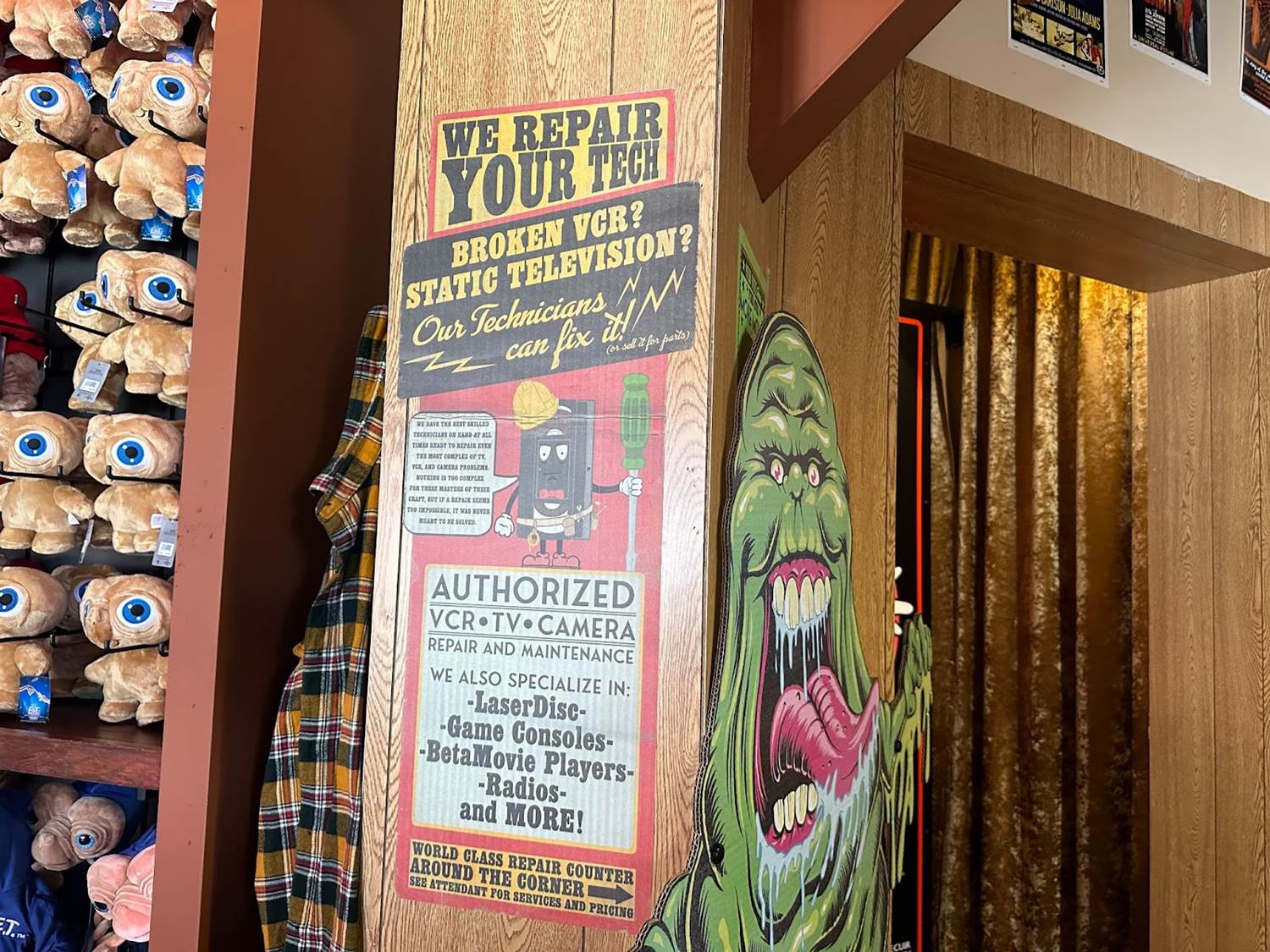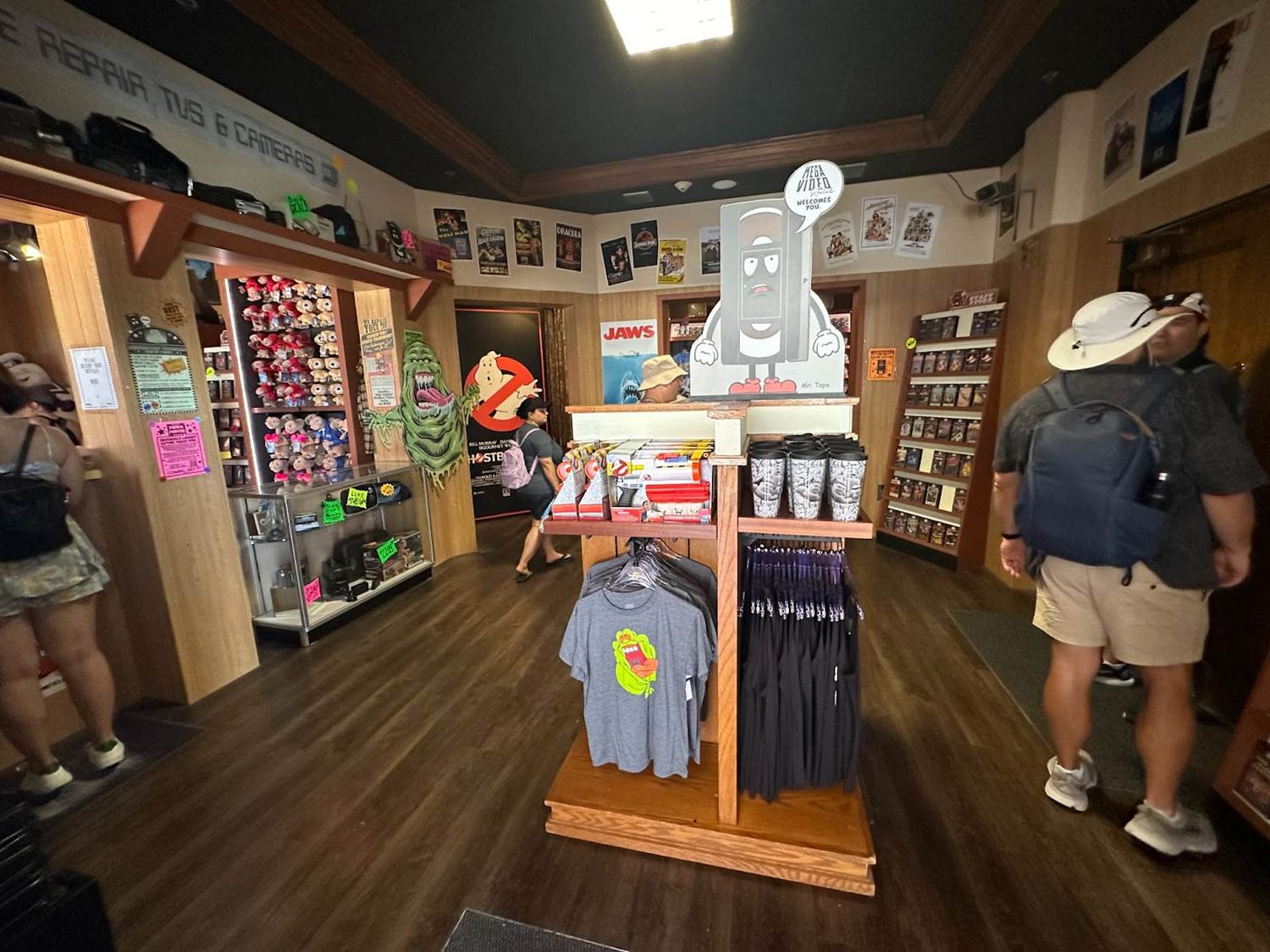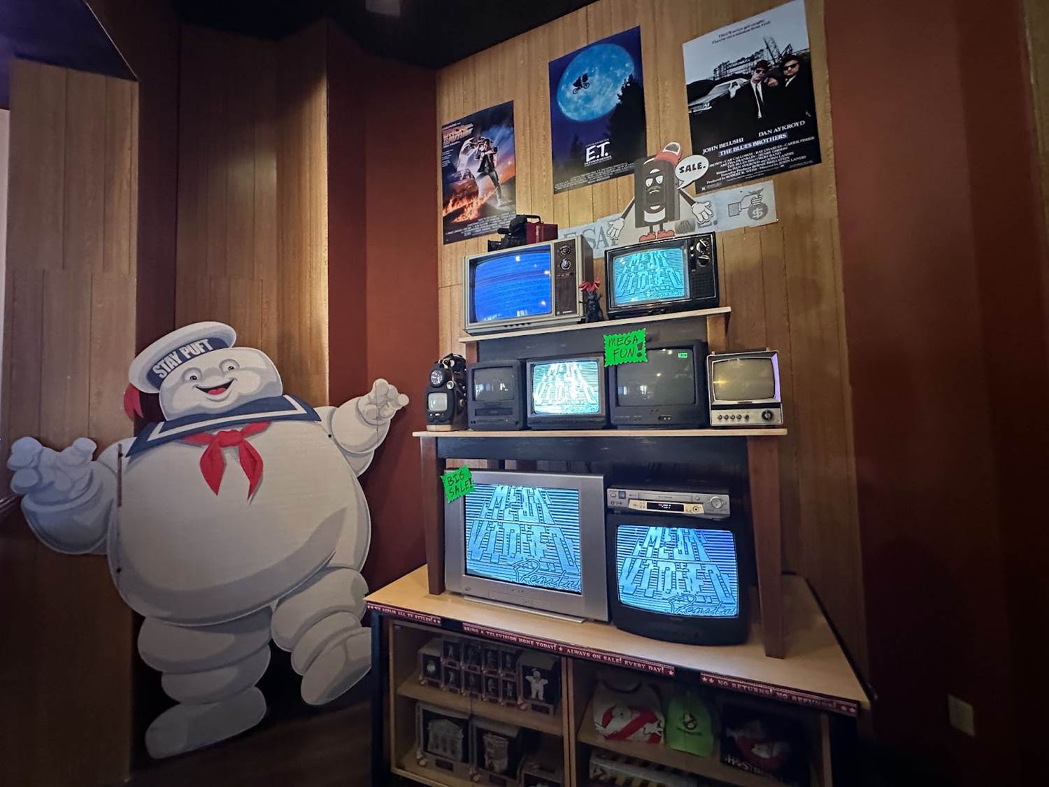 Entering the immersive shopping experience, guests will start their journey in Mega Video. The vintage movie rental-inspired store boasts shelves of old VHS tapes, cardboard character standees, and promo posters.