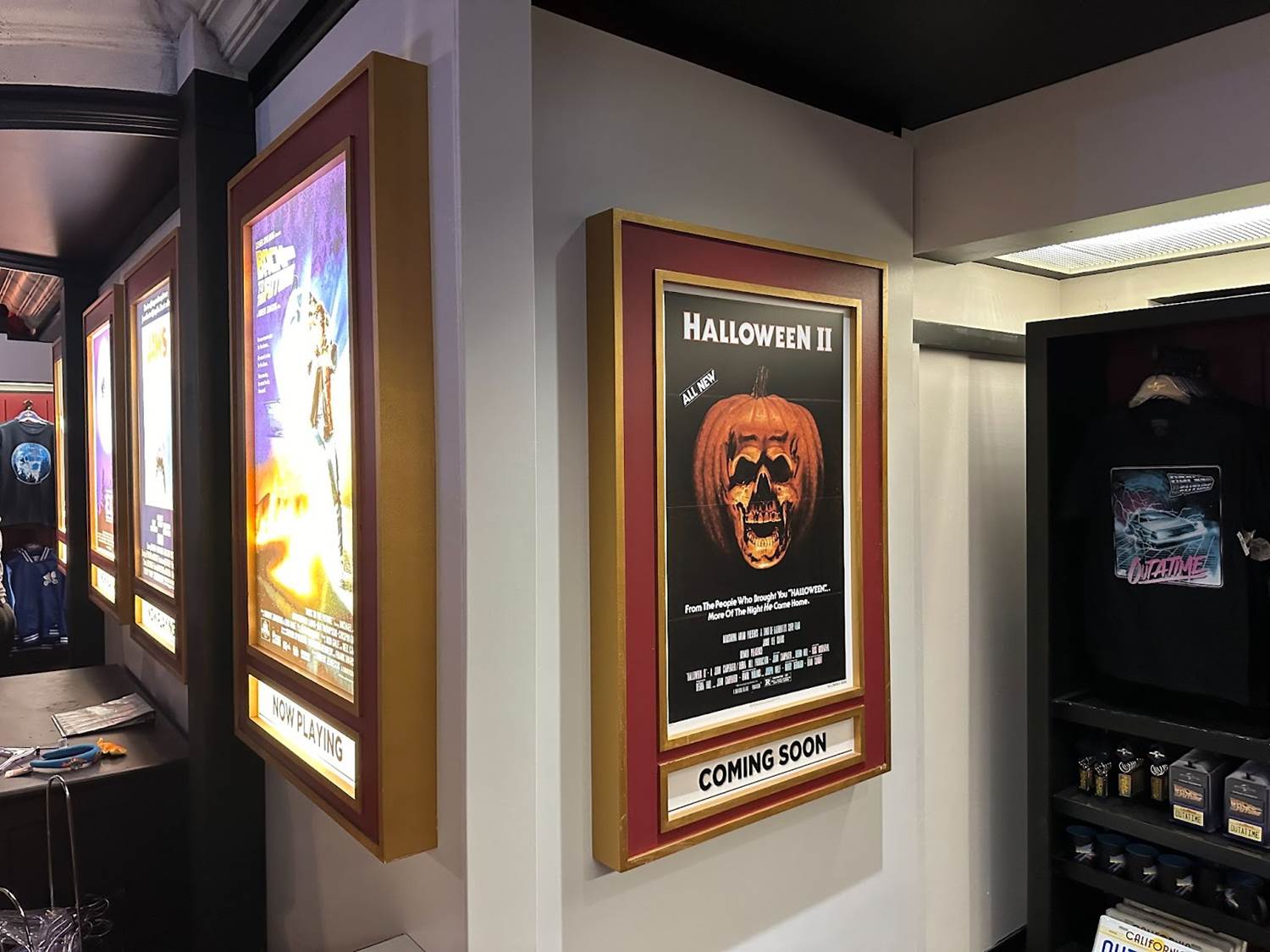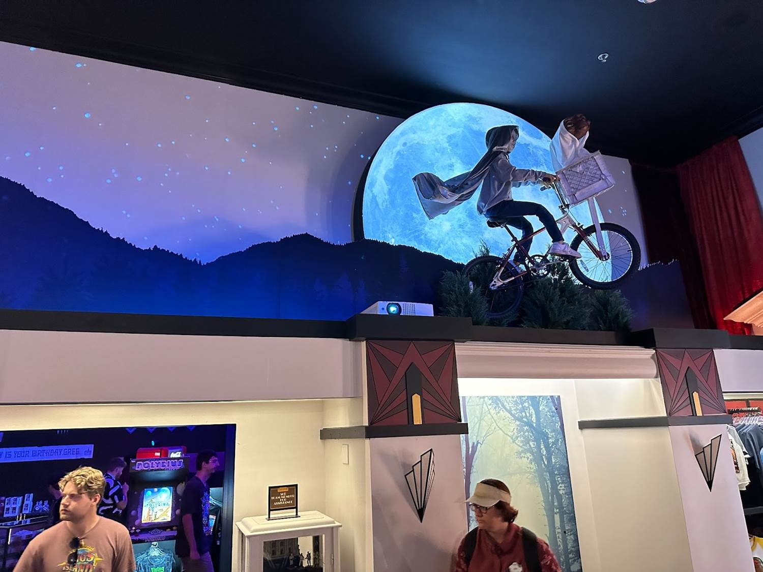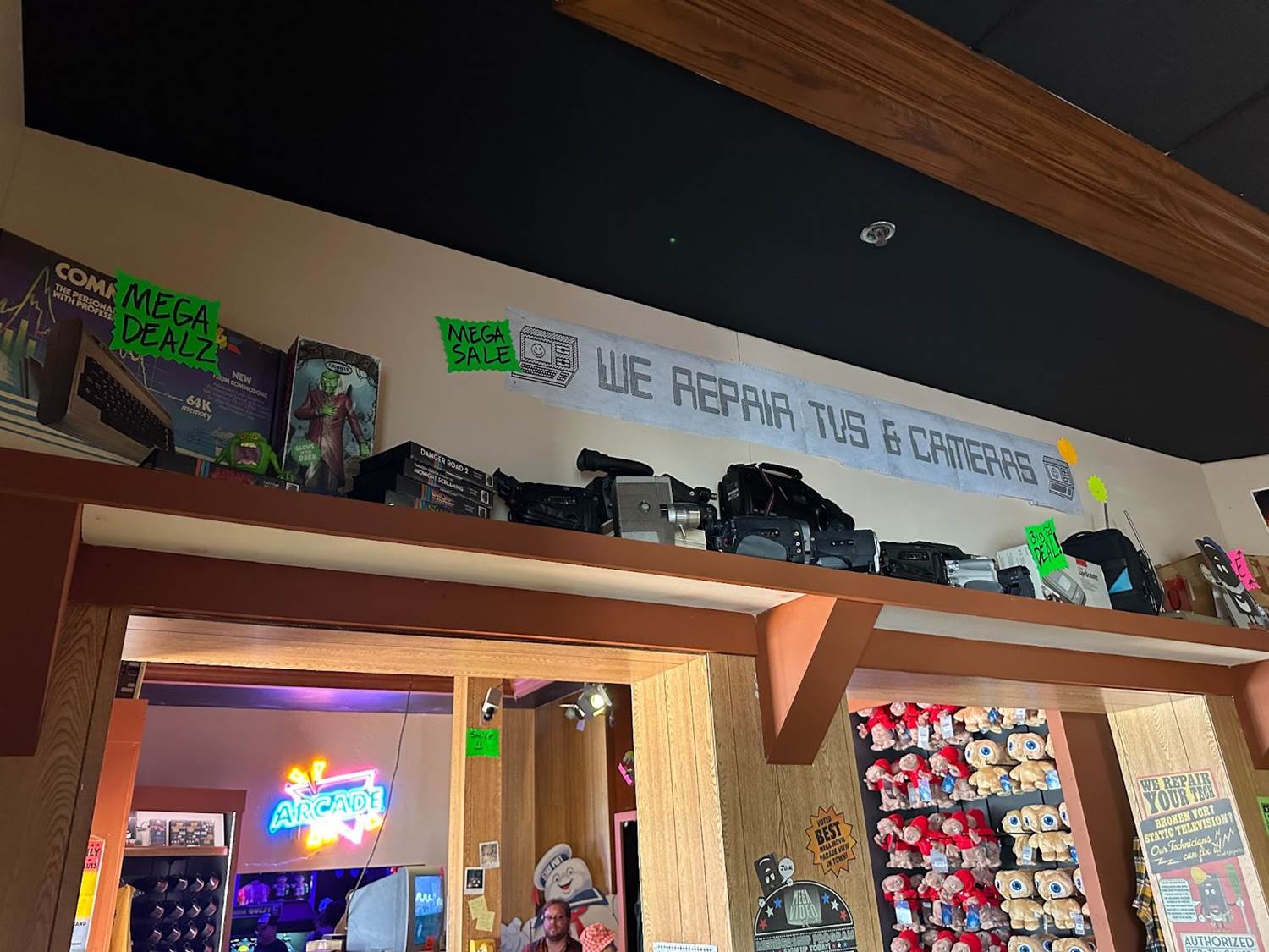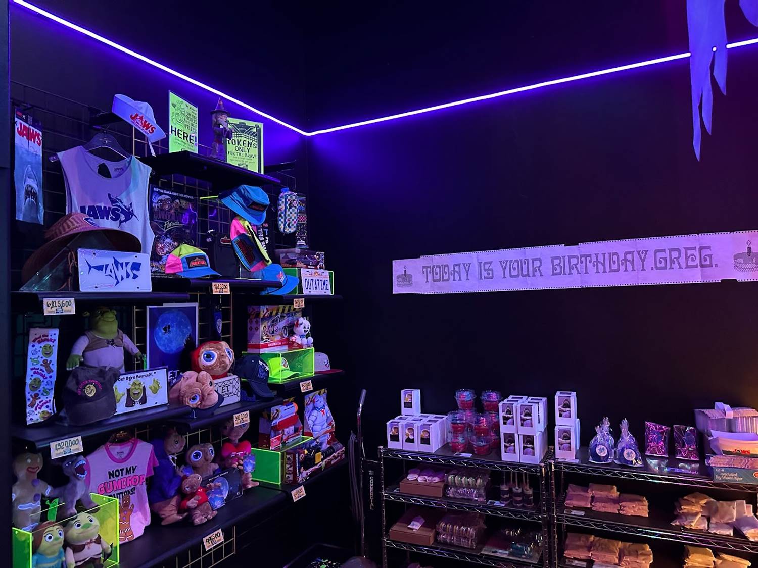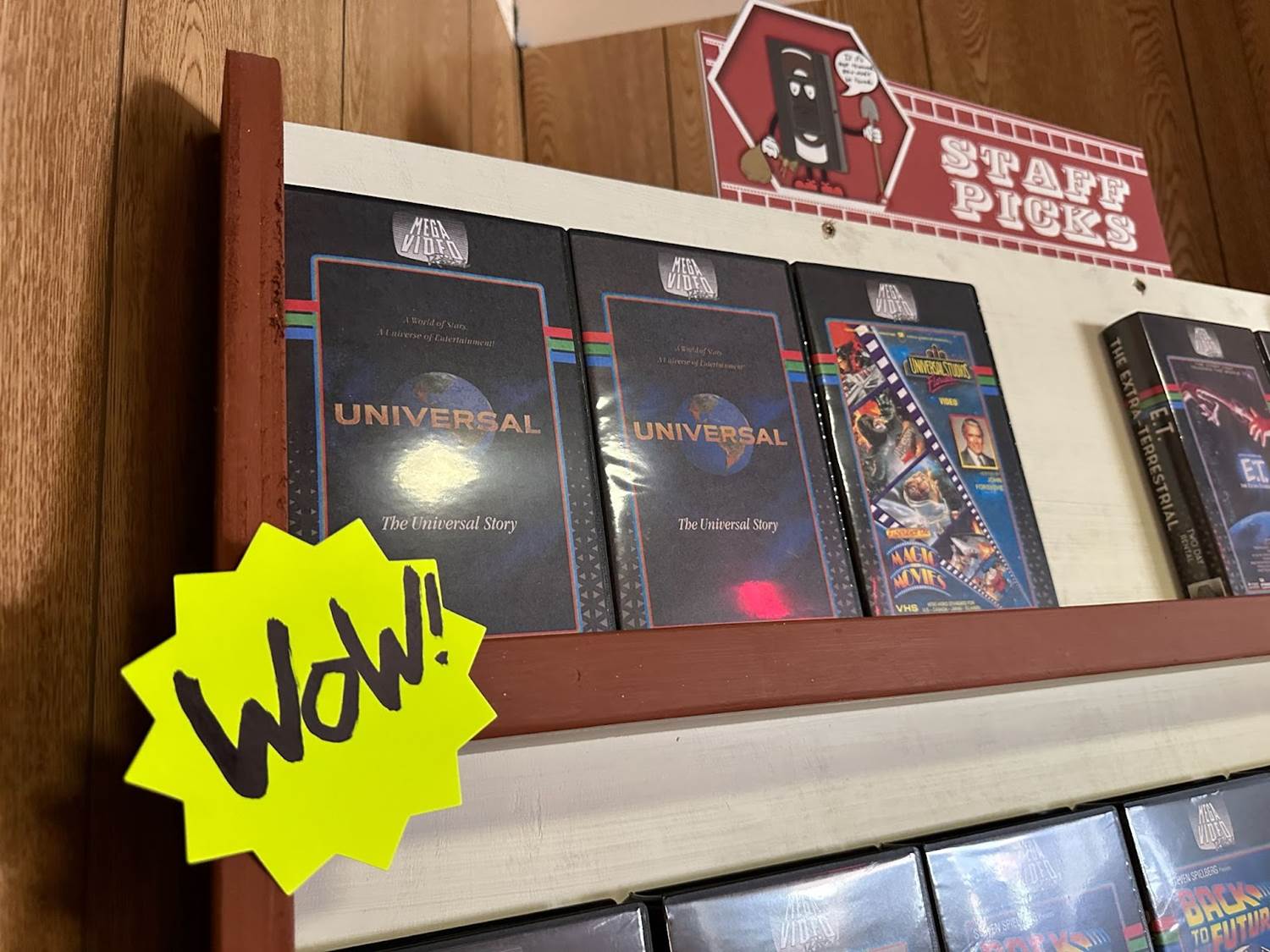 Entering the immersive shopping experience, guests will start their journey in Mega Video. The vintage movie rental-inspired store boasts shelves of old VHS tapes, cardboard character standees, and promo posters.