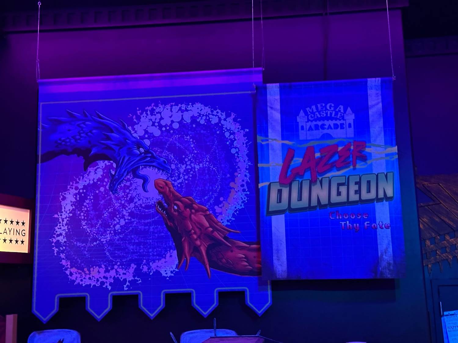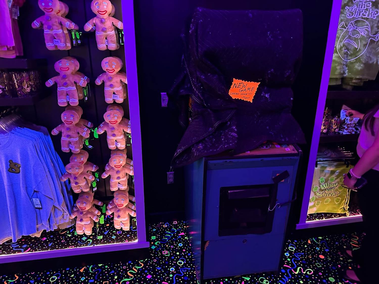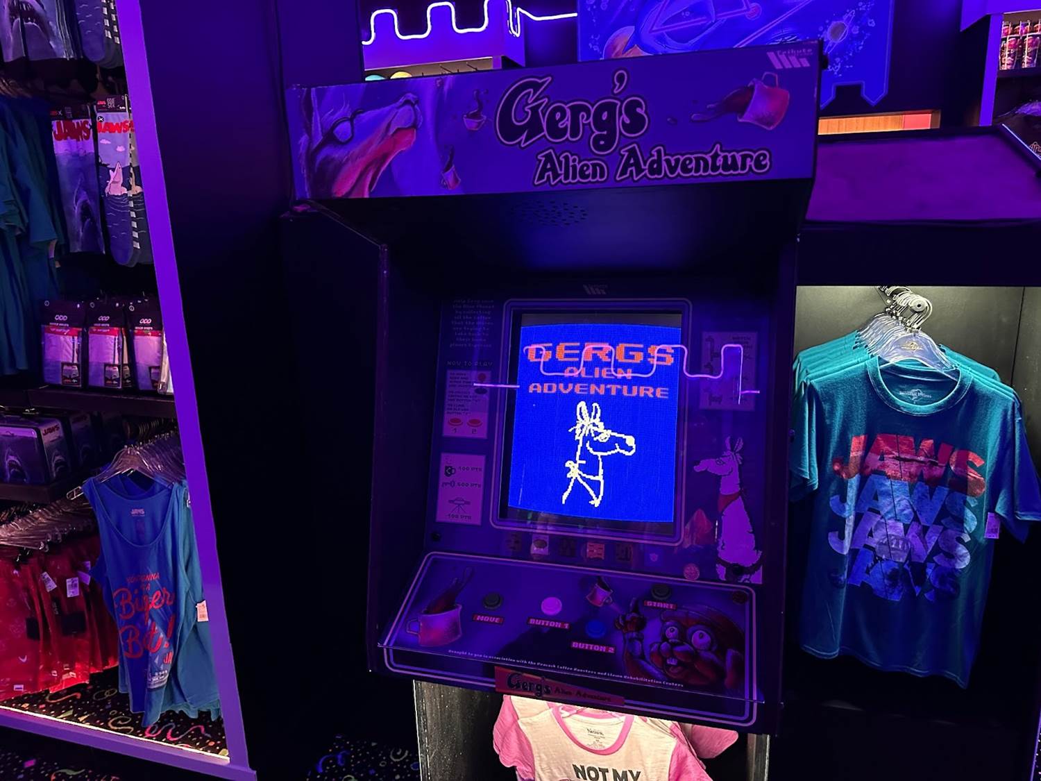 Next up, guests will head into Mega Castle Arcade. The blacklight illuminated room has countless Universal-inspired vintage arcade games and a prize counter for guests to explore. There is a playable Gerg Alien Adventure game, which is very similar to the E.T. Atari game from 1982. There’s even a Dueling Dragons reference.
