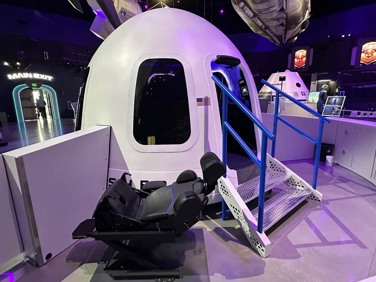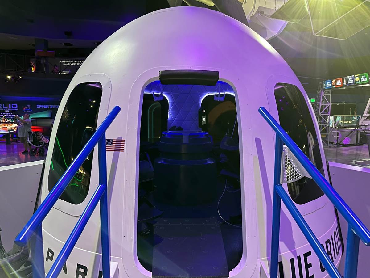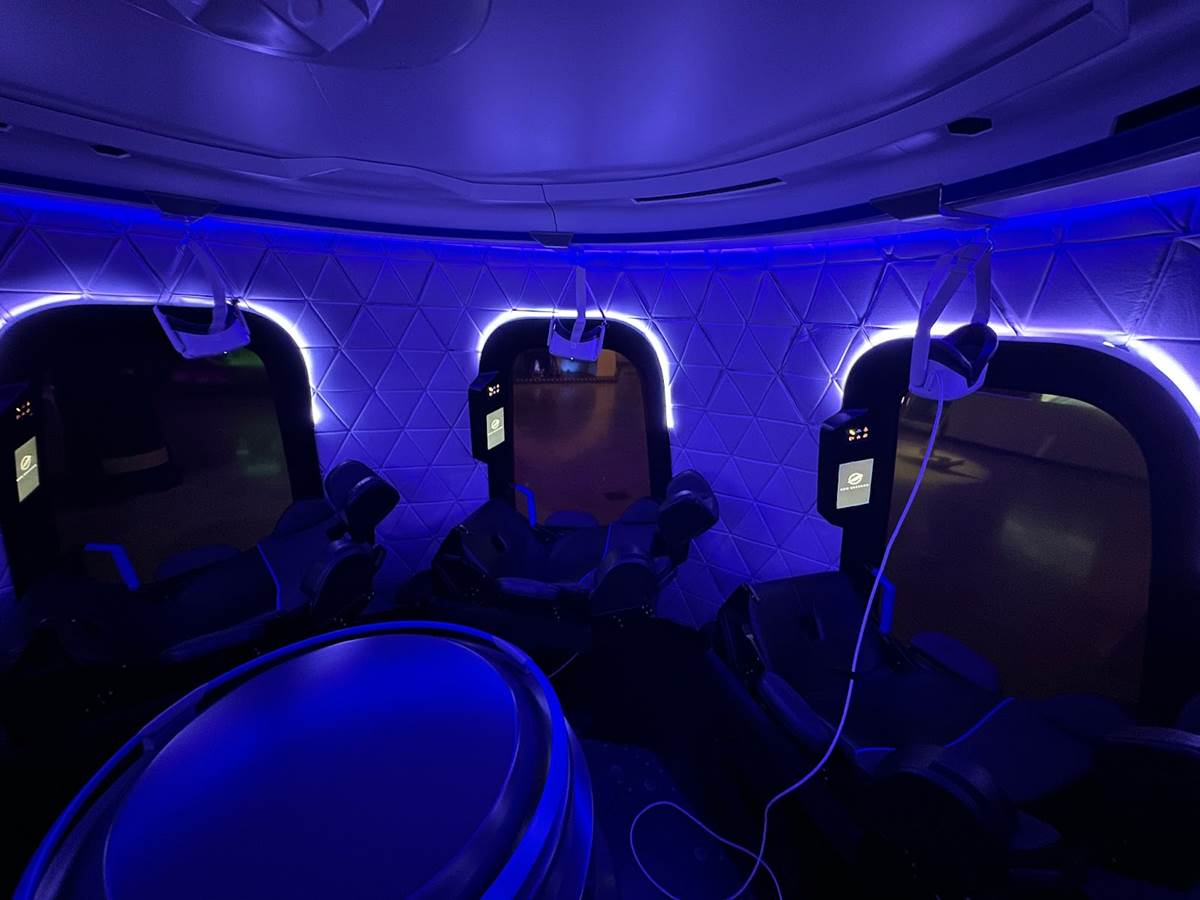 Guests enter into a near-perfect replica of the Blue Origin New Shepard capsule, where guests can enjoy a virtual reality experience. Laying down near flat, guests will put on a virtual reality headset and feel what it's like to take off into space aboard the New Shepard. Making use of a 360 degree camera, the 4-minute experience was filmed on a previous mission.