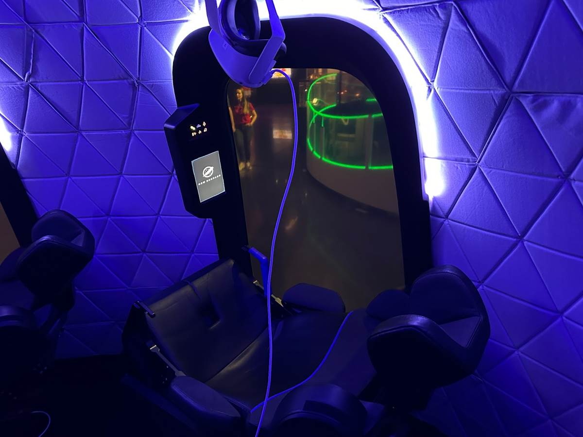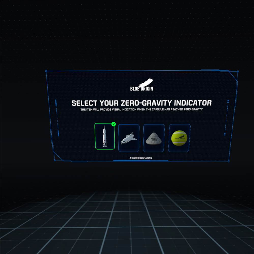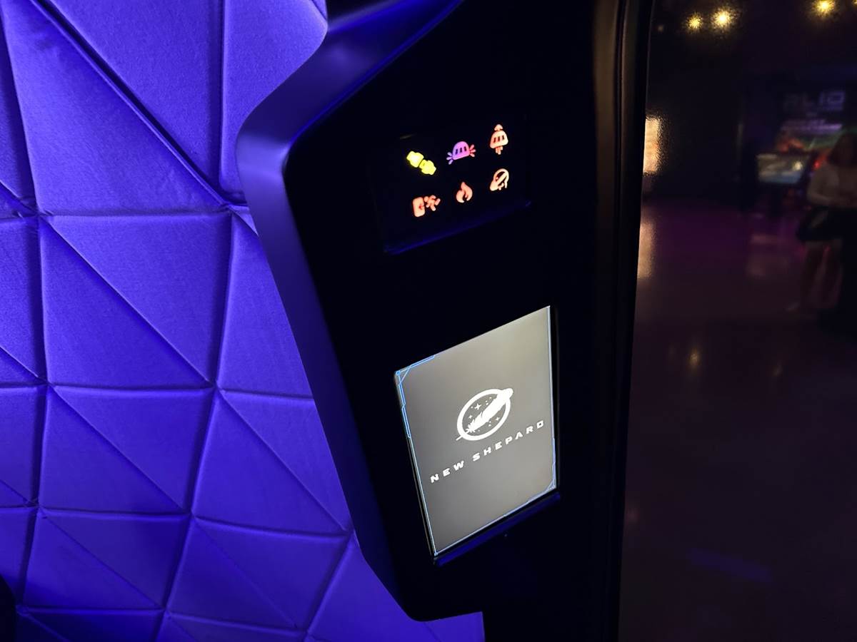 Guests enter into a near-perfect replica of the Blue Origin New Shepard capsule, where guests can enjoy a virtual reality experience. Laying down near flat, guests will put on a virtual reality headset and feel what it's like to take off into space aboard the New Shepard. Making use of a 360 degree camera, the 4-minute experience was filmed on a previous mission.