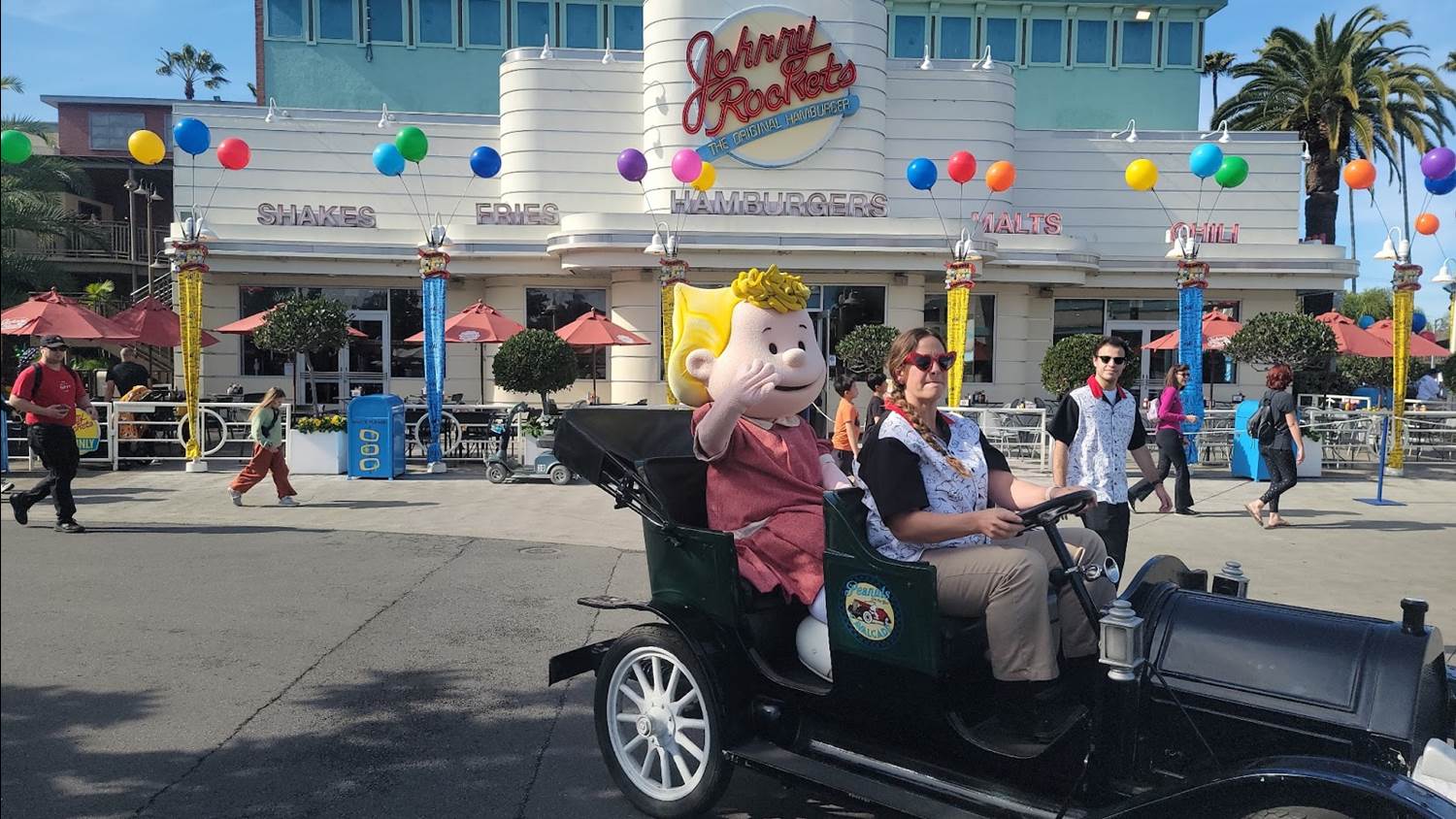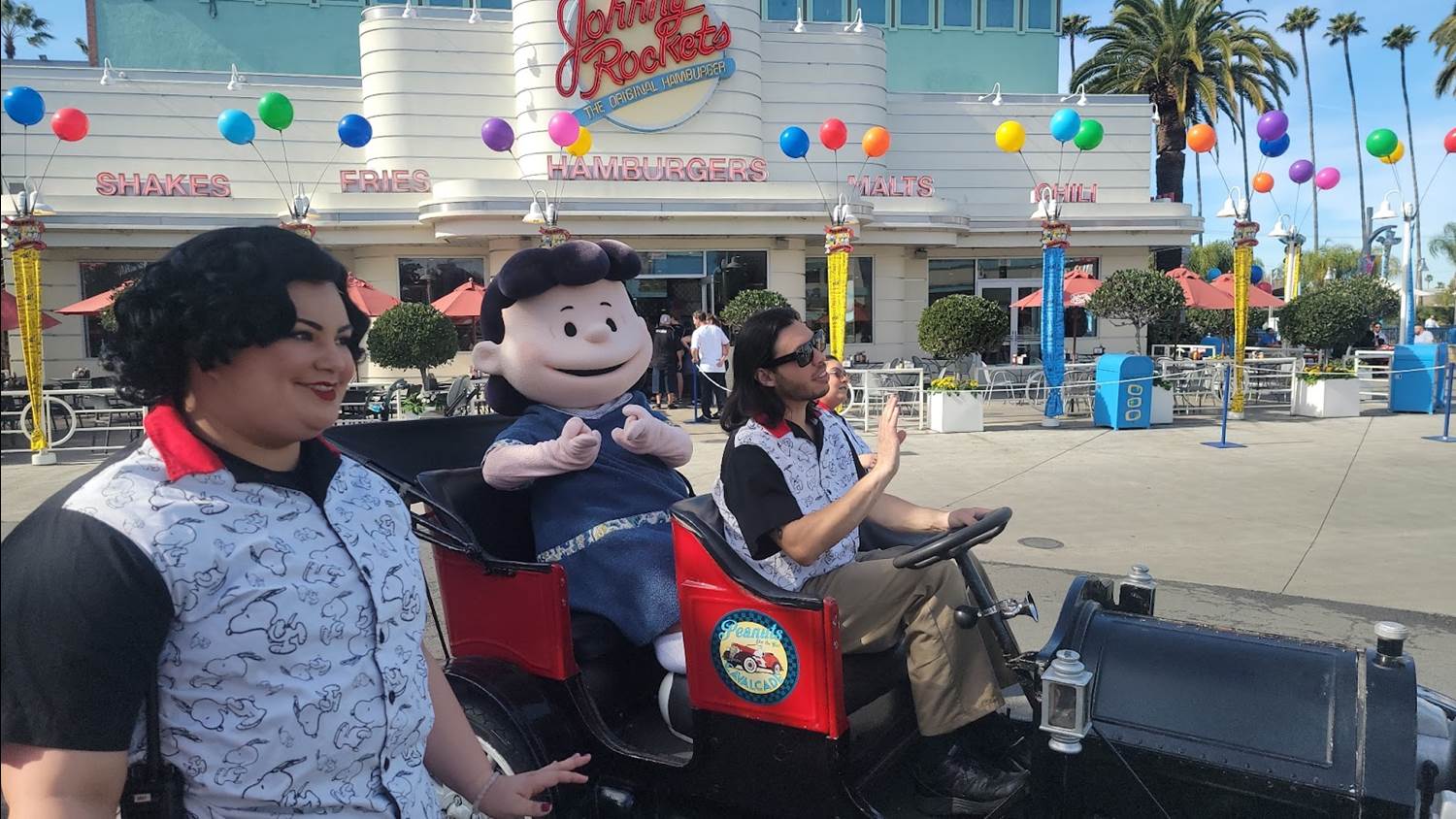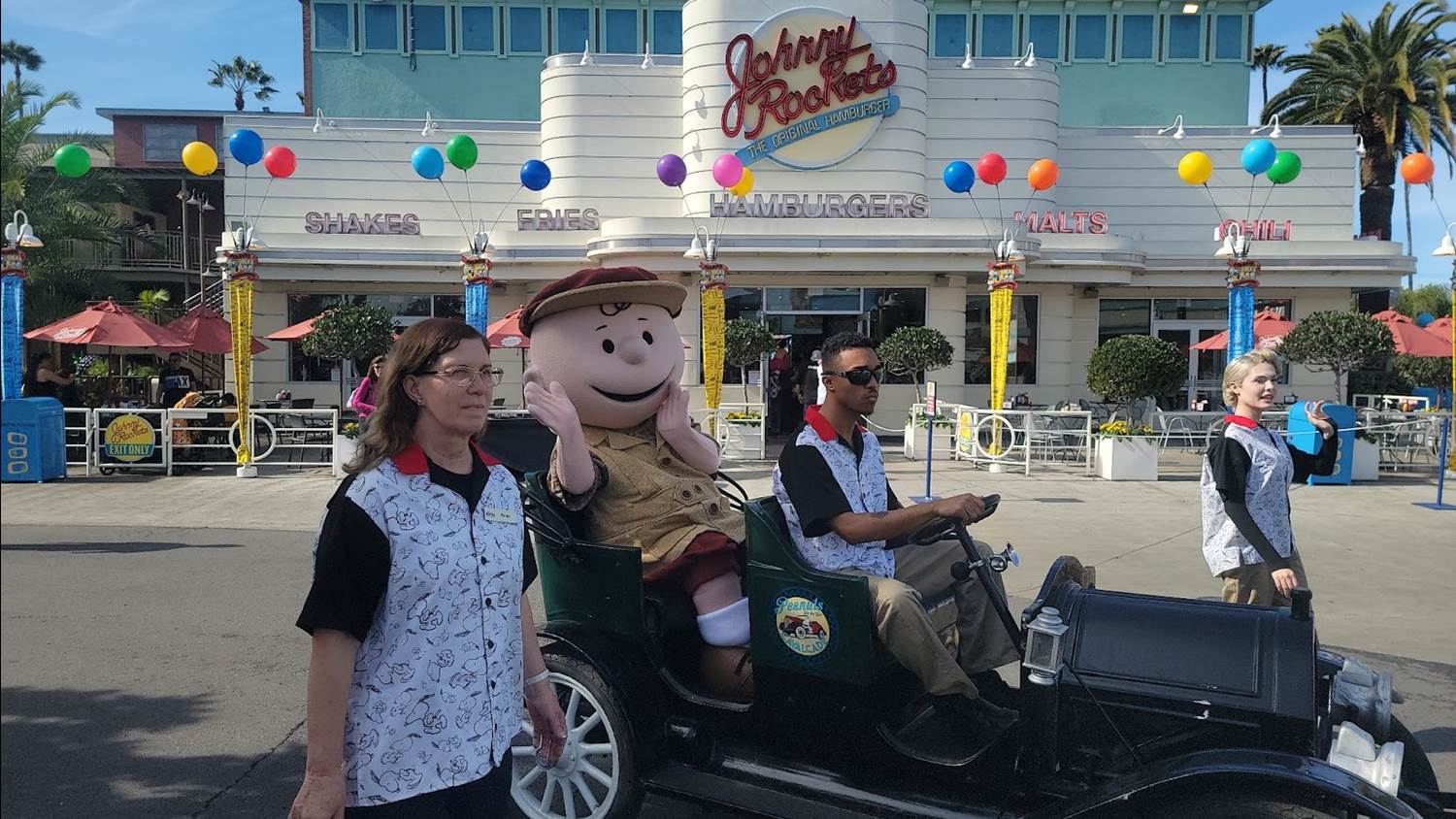 Over in Charleston Circle, the “Peanuts On the Go" cavalcade evolves into a dance-along with Charlie Brown, Sally, and Lucy Van Pelt. They arrive in antique cars that have been temporarily borrowed from Knott’s sister park, California’s Great America.