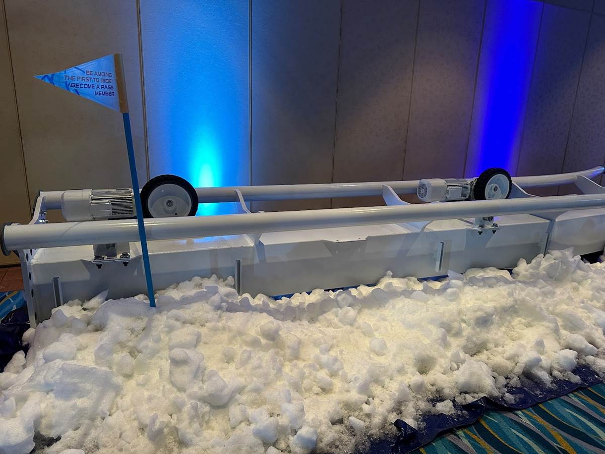 In addition to the debut of the attraction’s logo, we got to see a piece of the track for the coaster. Part of it is black, while part is white, signaling the transition from indoors to outdoors.