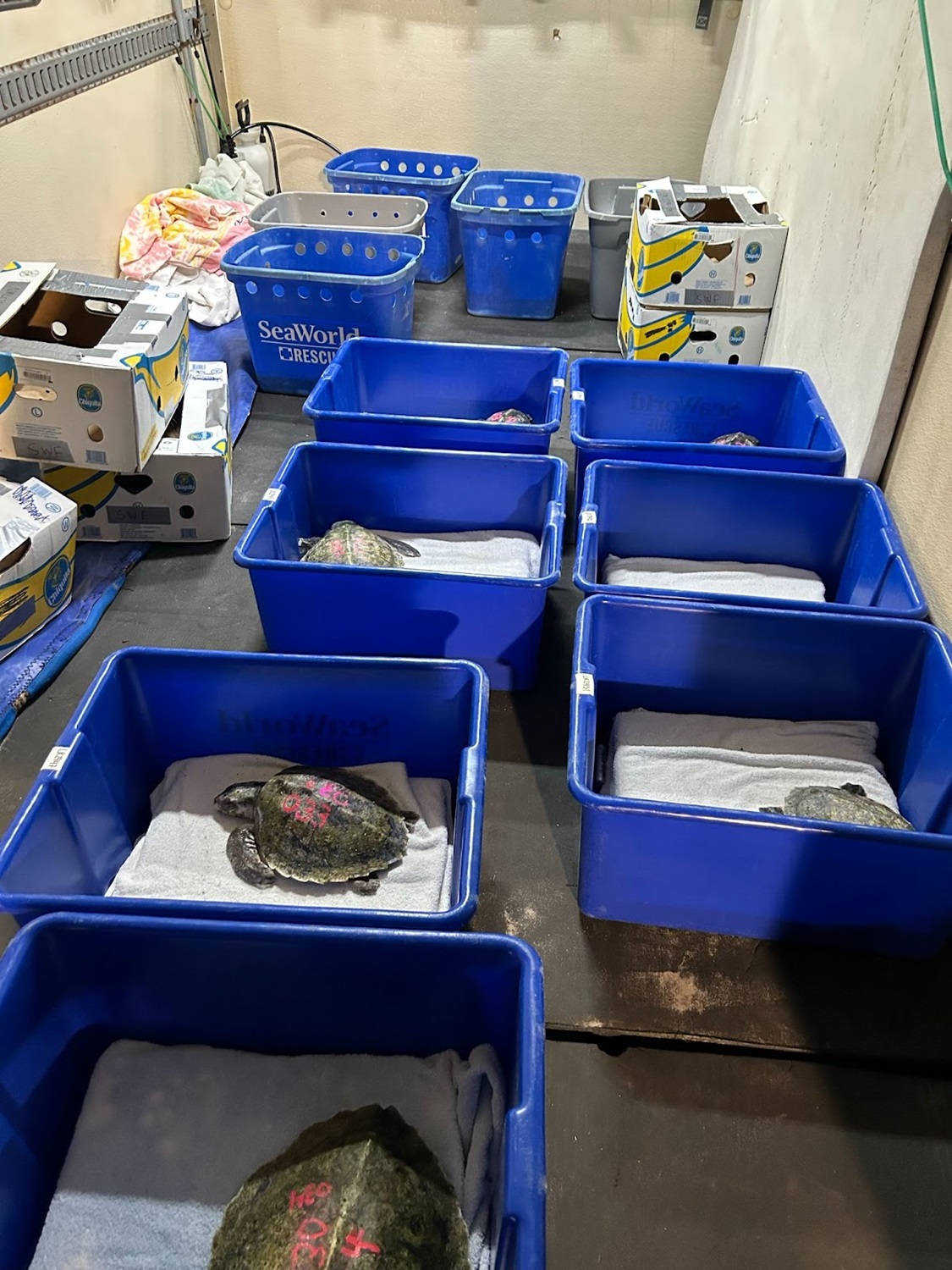 - The sea turtles currently at SeaWorld were part of a well-coordinated effort that facilitated the transport of 33 cold-stunned turtles from Massachusetts to rehabilitation facilities in Georgia and Florida.
