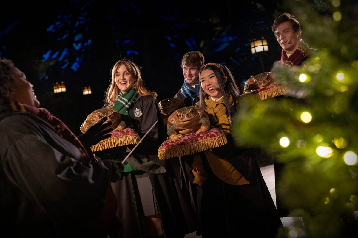 - Guests can take delight in special holiday a cappella performances from the Frog Choir, stroll through the village shops while sipping delicious hot Butterbeer or savor festive fare at Three Broomsticks.