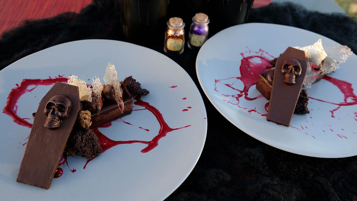 - Indulge in Dracula’s Coffin Cake, with velvety chocolate coffin tops cut by hand to shape and raspberry coulis splattered across the plate, for a frightful delight. These “to die for" treats are available now through October 31st.