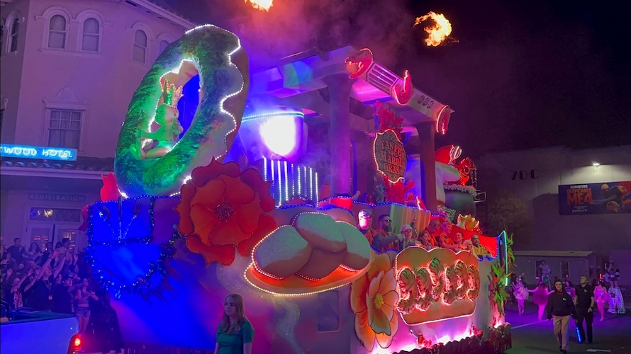 The massive floats and tons of performers are letting the good times roll at Universal Orlando.