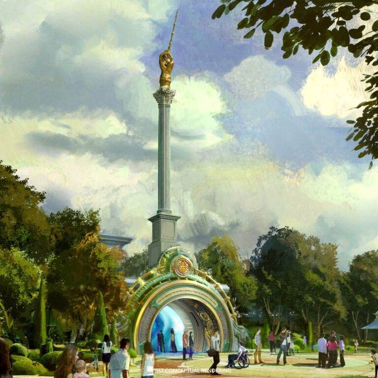 - In this imaginative world, guests will wander through lush living gardens nestled along shimmering waters while being surrounded by stunning architecture inspired by astronomical and mythological elements.