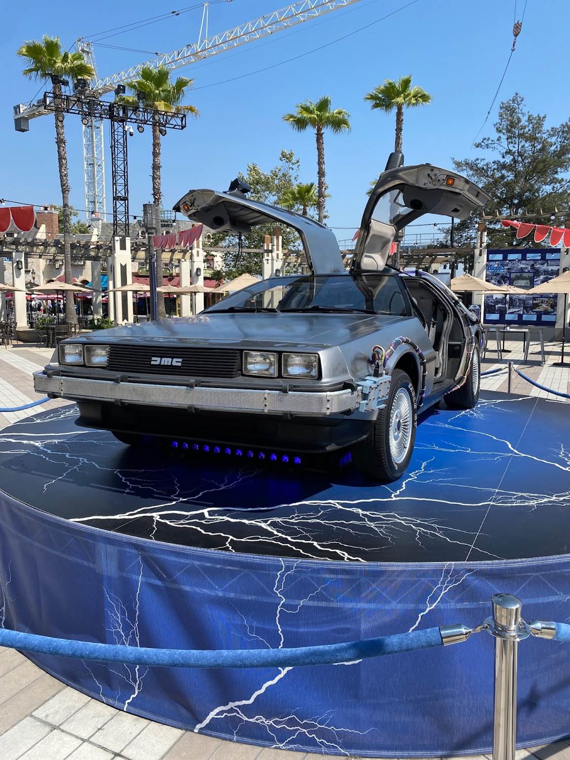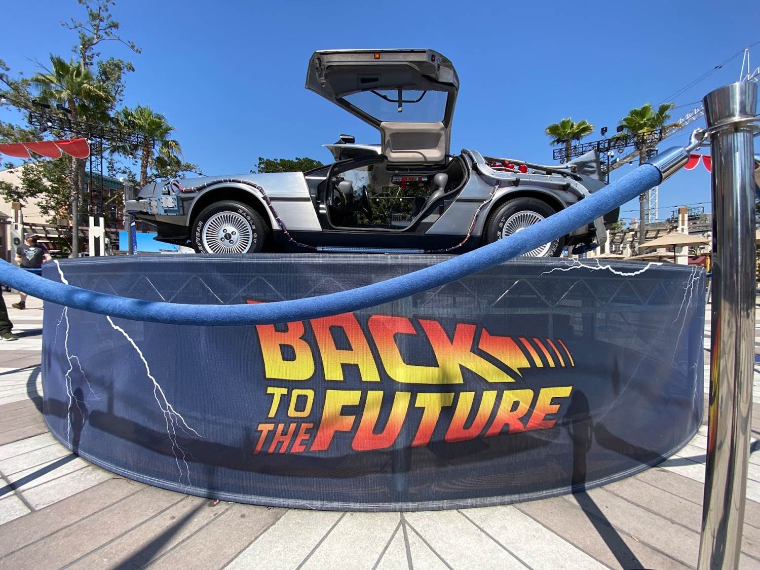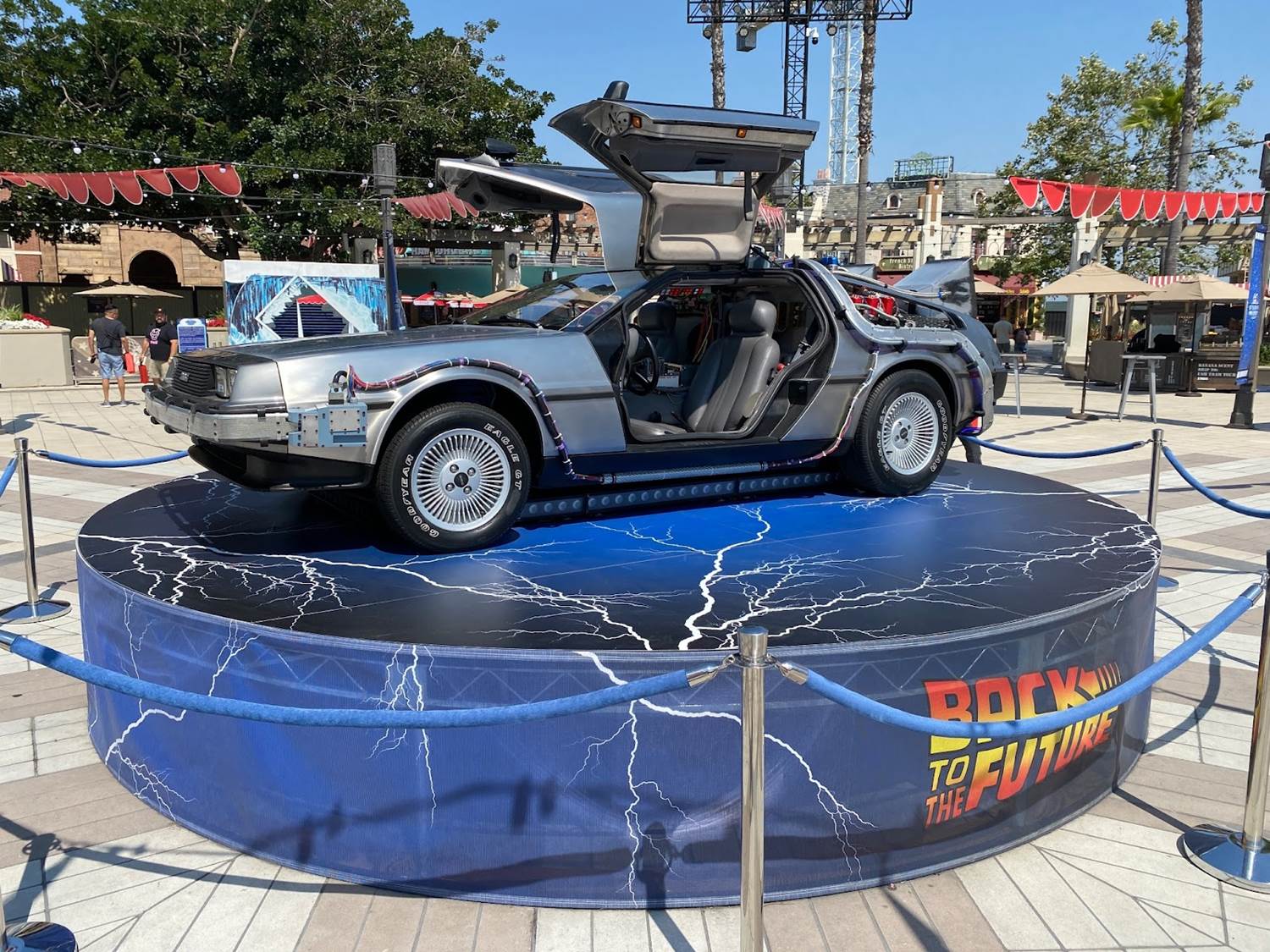 The grand centerpiece of Universal Plaza is a replica DeLorean from the Back to the Future franchise.