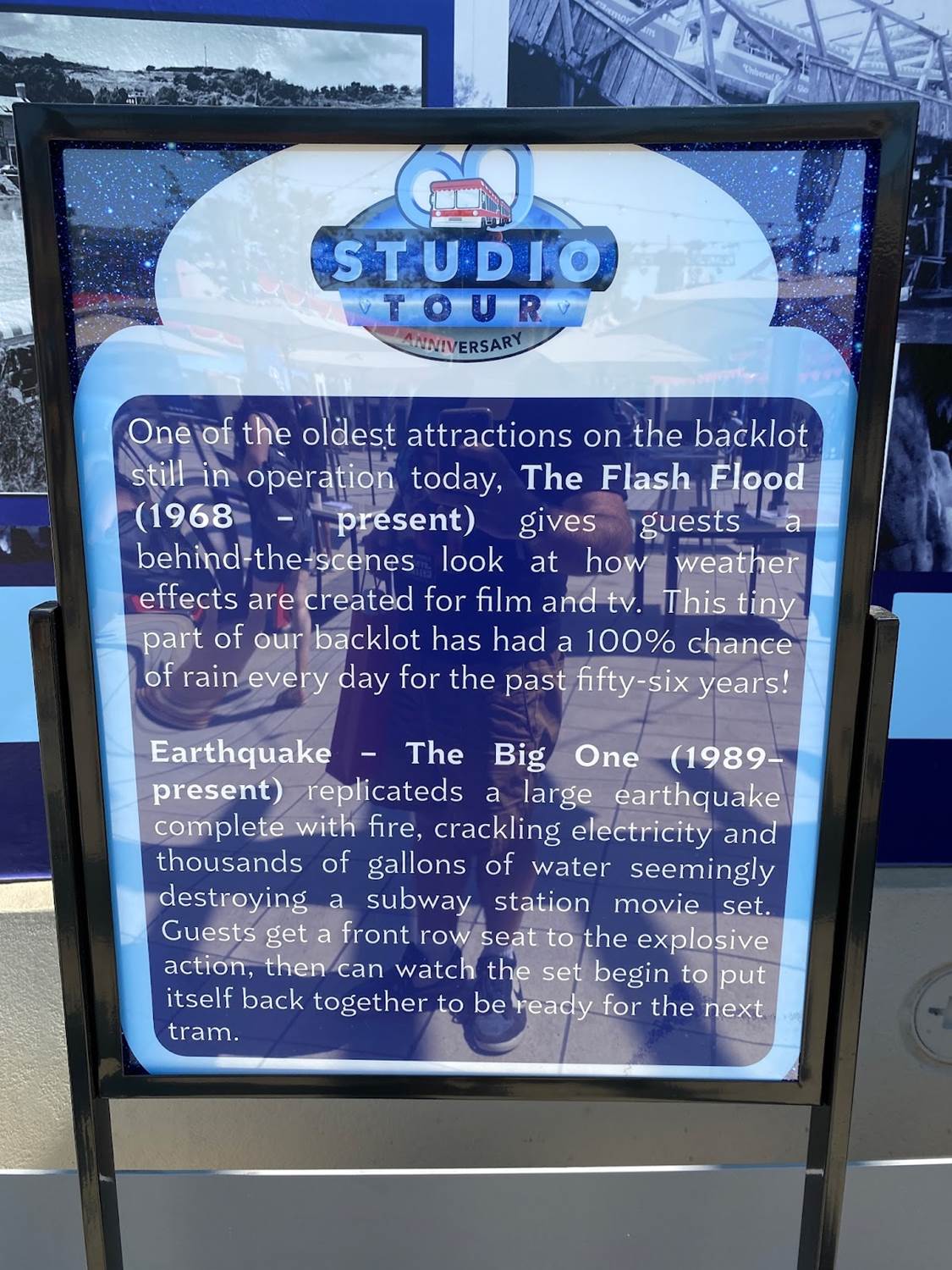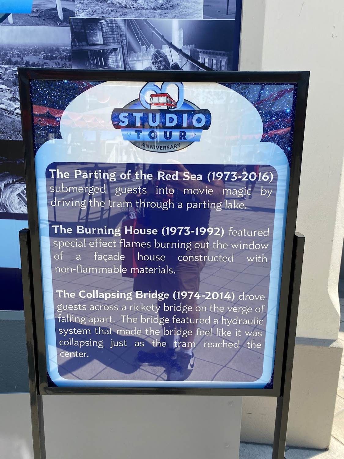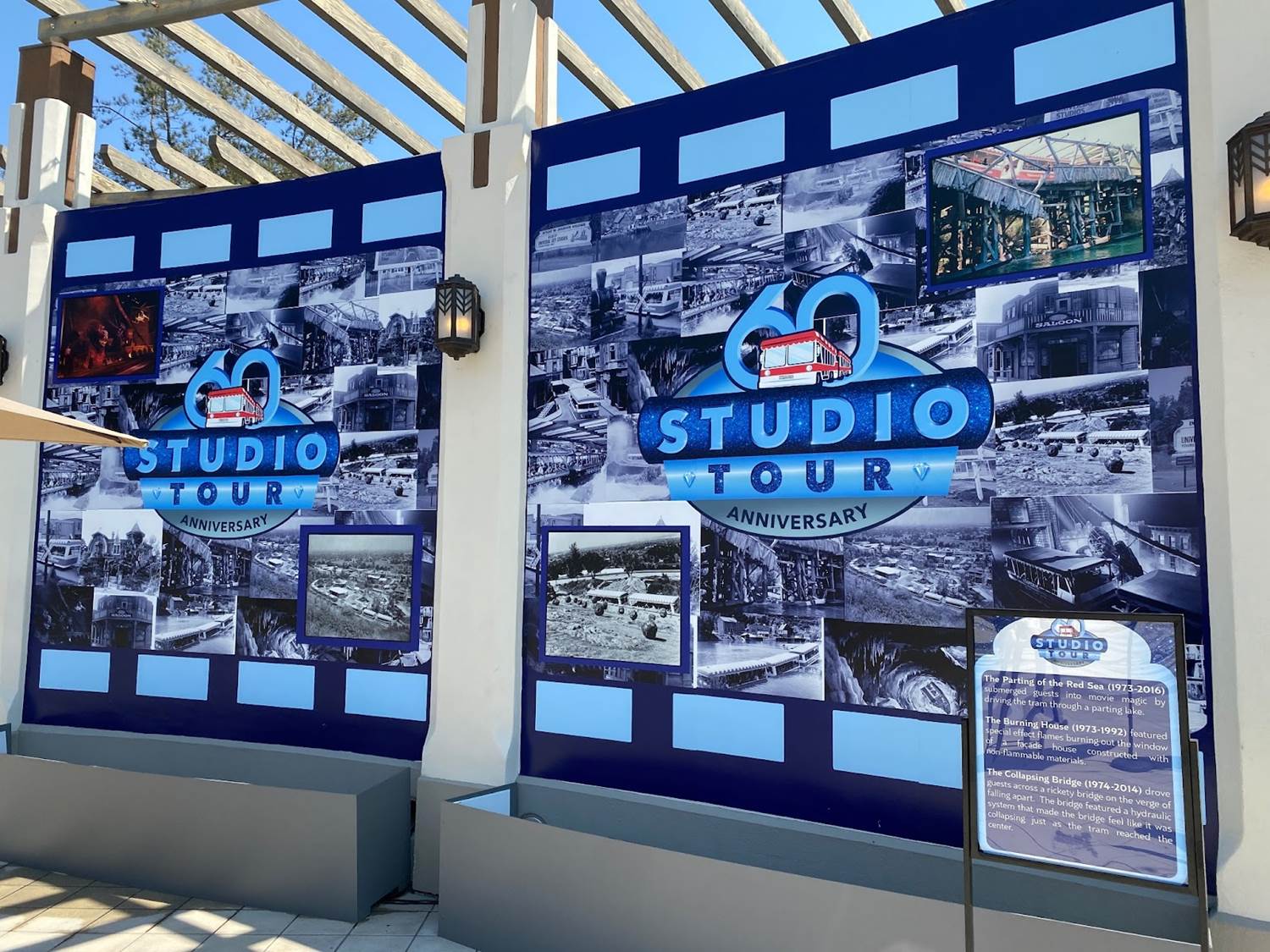 A collage of vintage photos lines the back of the area, showcasing classic elements of the Studio Tour, such as the Parting of the Red Sea, the Burning House, the Collapsing Bridge, and many more!