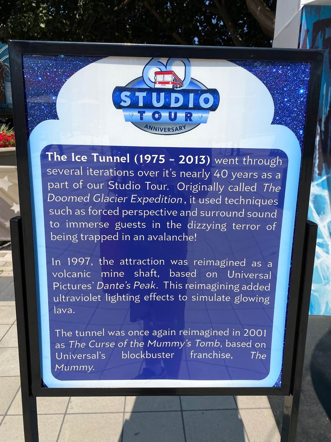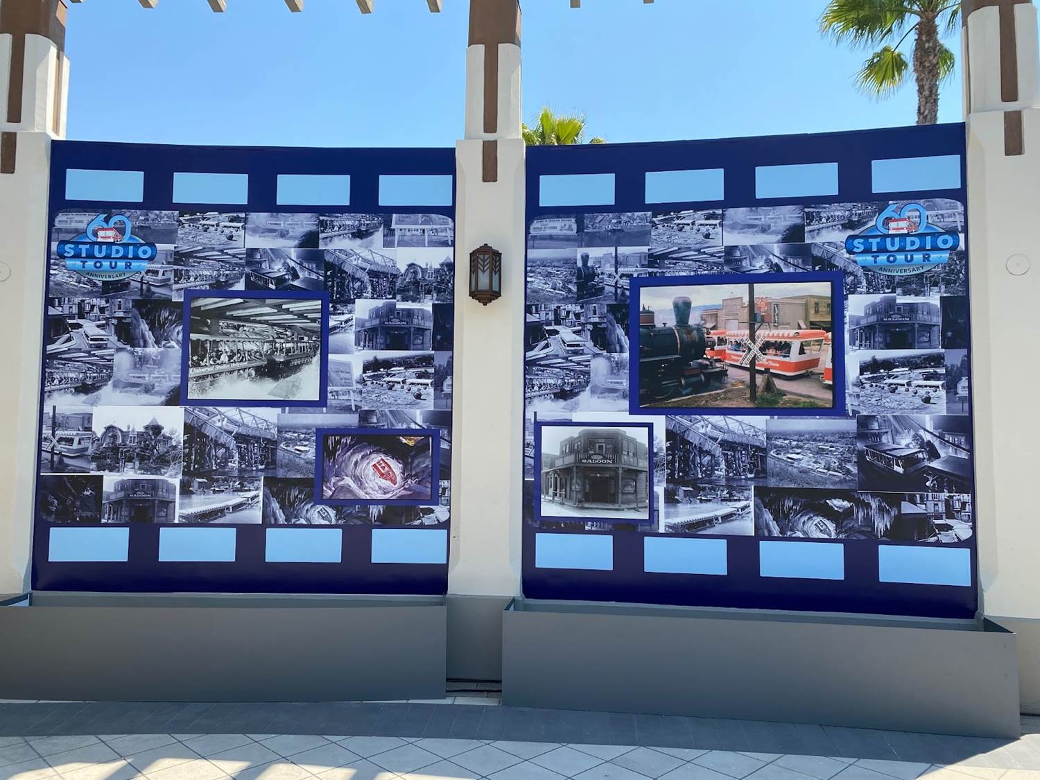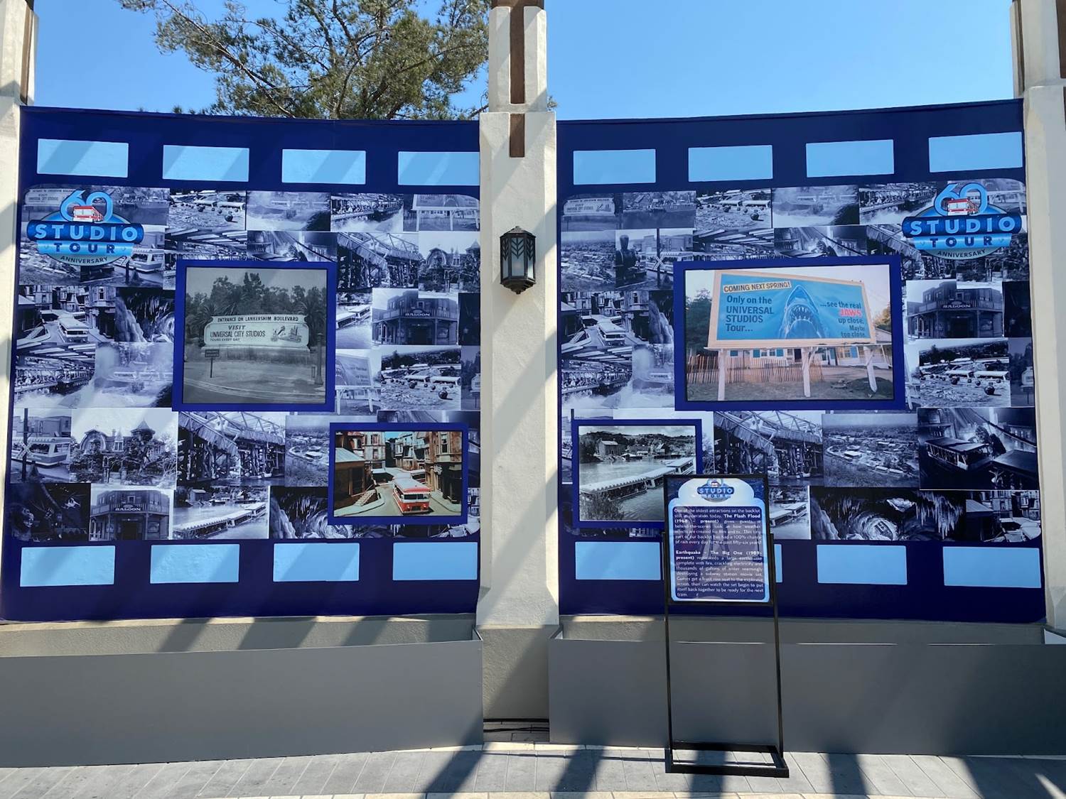 A collage of vintage photos lines the back of the area, showcasing classic elements of the Studio Tour, such as the Parting of the Red Sea, the Burning House, the Collapsing Bridge, and many more!