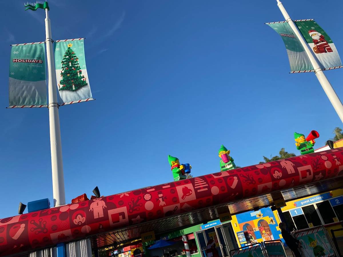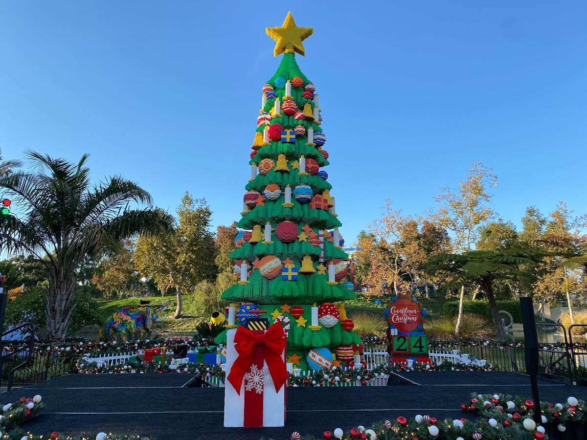 Outside of the entrance to LEGOLAND California, guests will find a statue of LEGO Santa Claus greeting them on the way in, next to a smaller tree made of oversized LEGO.