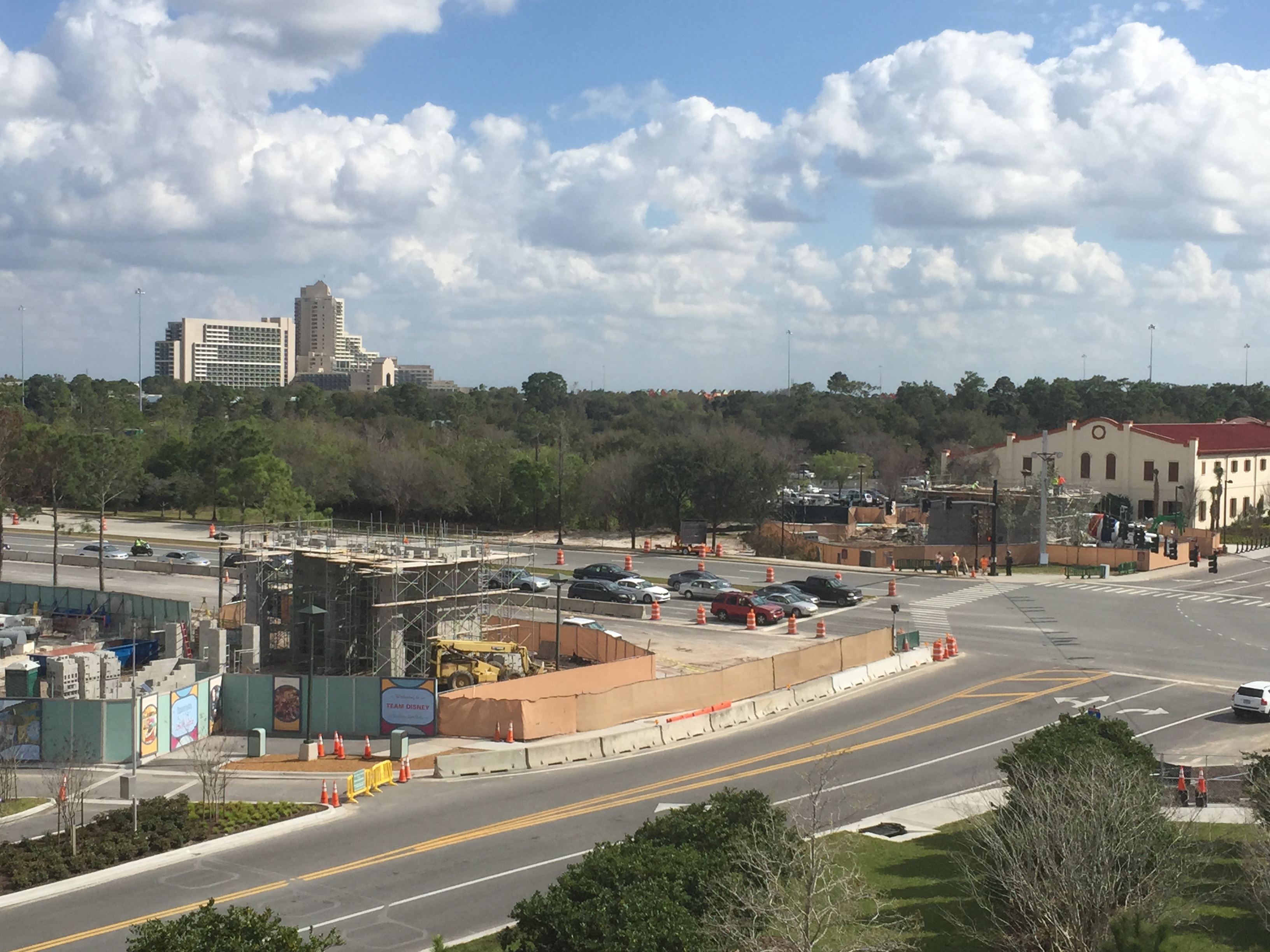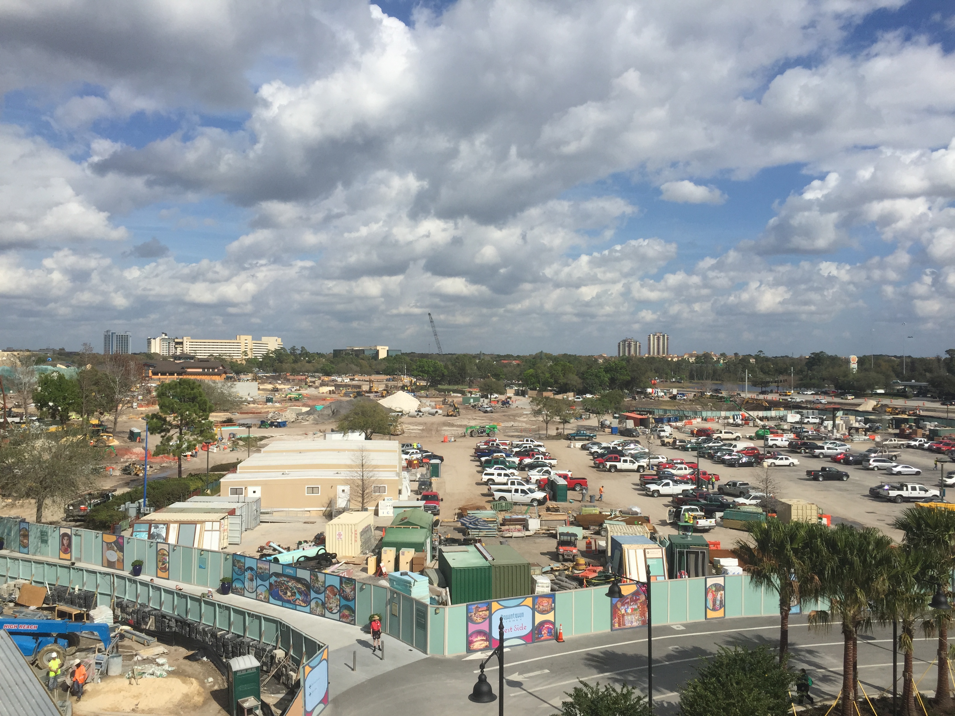 As we head out of the garage we see the former Pleasure Island parking area has now become a large dirt lot and in the background you can see work on the expansion of World of Disney.