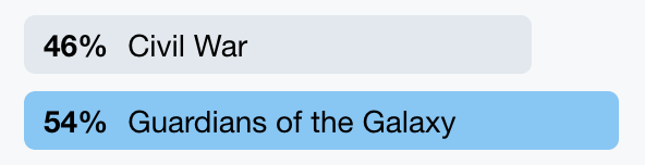 Beating out Civil War in the final match up of 2018, Guardians of the Galaxy can now proudly claim the title: The Best Film in the Marvel Cinematic Universe...so far! We love this group of mismatched weirdos and their crazy antics. They might not be the smartest individuals, but they sure are brave. Even with the odd stacked up against them, and only 12% of a plan, this five-some stepped in front of Ronan the Destroyer to prevent him from wiping out an entire planet. And they acquired an Infinity Stone along the way! "Come and Get Your Love," Guardians, because we the fans of the MCU think you're pretty stellar.